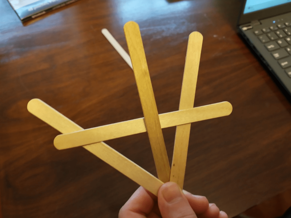 Finally put the last popsicle stick on top of the MIDDLE popsicle stick, and under the V-SHAPED popsicle stick. (It works better if you only put a tiny bit under the V-SHAPED sticks)