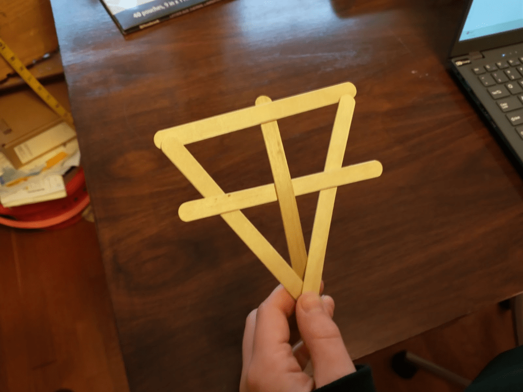 Put a popsicle stick on top of the V-SHAPED popsicle sticks, but under the MIDDLE popsicle stick.